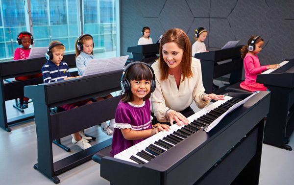 Piano individuel avec casque : chaque élève dispose de son piano numérique et d’un casque pour jouer en autonomie, au sein d’un groupe.
