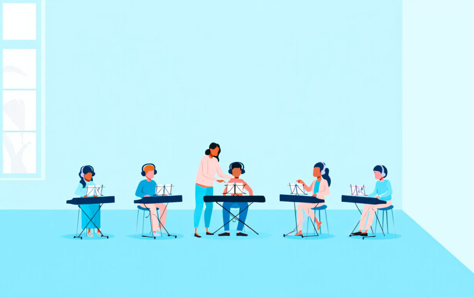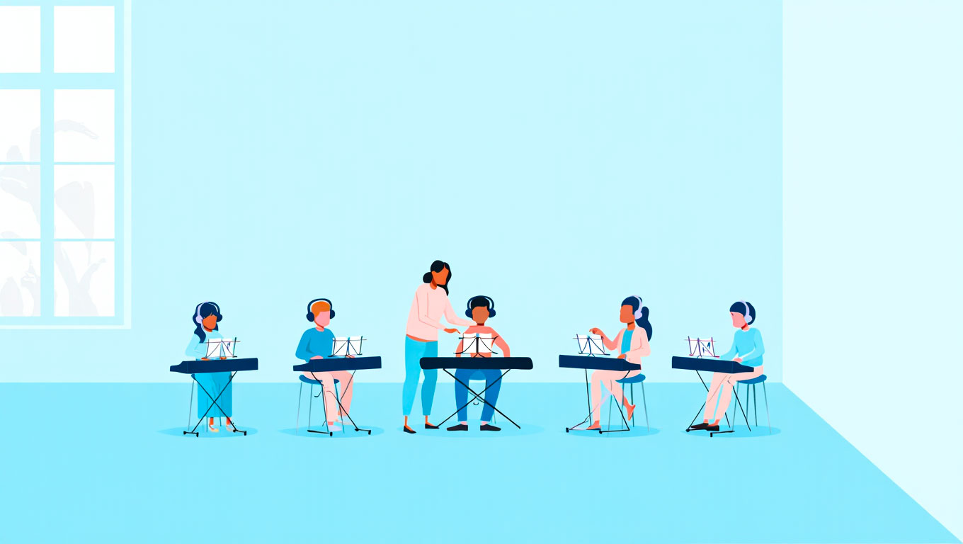 Dans un cours collectif individualisé, plusieurs élèves travaillent en même temps, mais chacun avance sur son programme, à son rythme. Le professeur circule, observe, corrige, fixe des objectifs précis, et laisse ensuite l’élève répéter pour consolider. Le cœur de l’apprentissage se fait au clavier, dans la répétition intelligente.