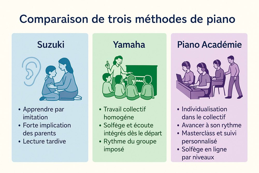 Voici une présentation claire des trois grandes approches pédagogiques utilisées aujourd’hui : Suzuki, Yamaha et Piano Académie.