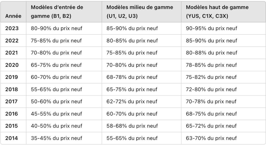 Modèle et série : Les séries plus haut de gamme (comme les séries U et YUS) conservent mieux leur valeur que les modèles d’entrée de gamme.